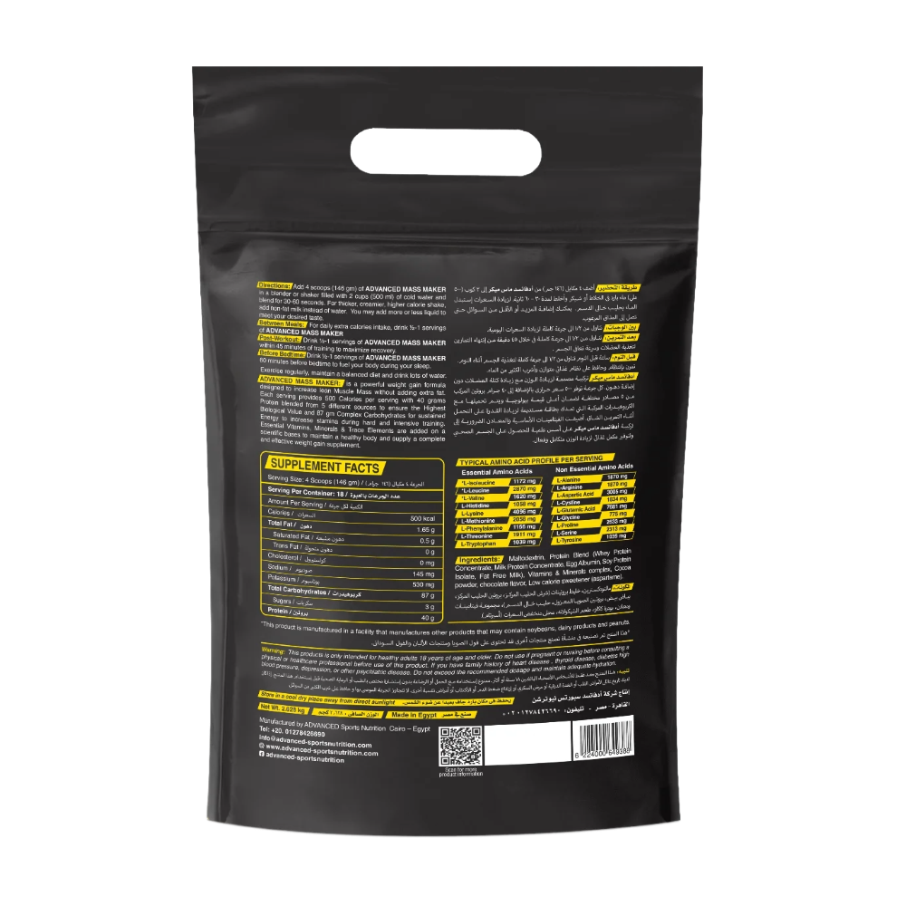 Advanced Mass Maker is a powerful, high-protein weight gain formula designed for individuals looking to build muscle and increase body mass. This advanced formula provides a massive 530 calories per serving, with 40g of high-quality protein and 87g of complex carbohydrates to fuel your body and support sustained energy. It’s the ultimate tool for serious athletes aiming to pack on size and strength.