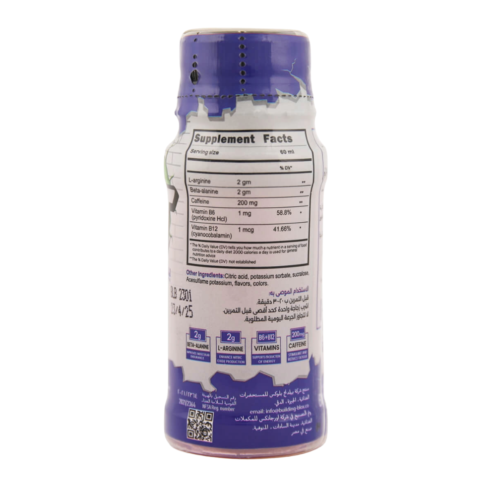 Unleash “The Extreme Rush” with Building Blox Bolt Pre-workout. This powerful 60ml shot is scientifically formulated to take your training sessions to the next level. Packed with key performance-enhancing ingredients like Beta-Alanine, L-Arginine, and a potent 200mg of caffeine, BOLT is designed to enhance muscle endurance, boost nitric oxide production for incredible pumps, and provide the stimulant and focus you need to crush your goals.