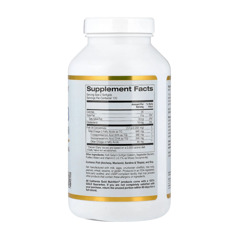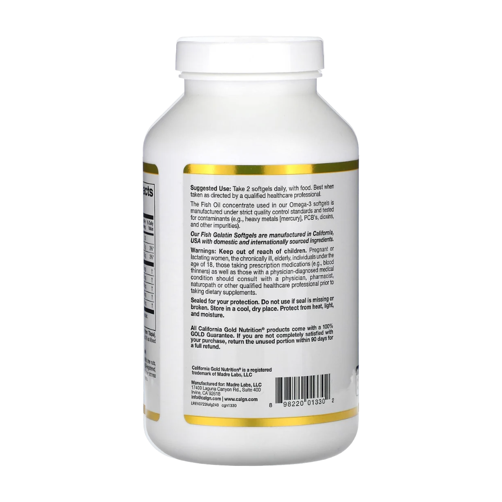 Support your overall health with California Gold Nutrition’s Omega-3 Premium Fish Oil. This high-quality fish oil concentrate is manufactured under strict quality control standards and tested for contaminants like heavy metals, mercury, and PCBs. Each serving provides 360 mg of EPA and 240 mg of DHA, encapsulated in fish gelatin softgels, making it an excellent choice for your daily wellness routine.