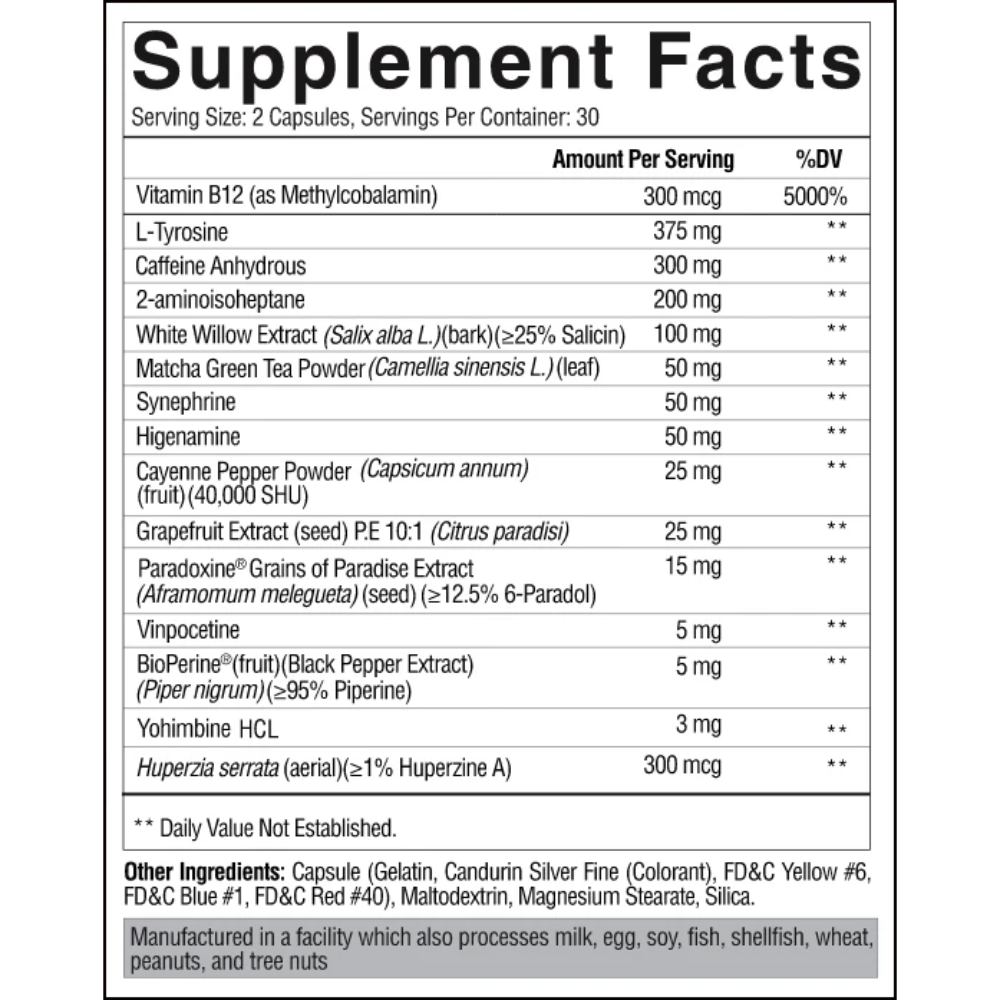 • Intense Energy & Focus: Loaded with 300mg of Caffeine Anhydrous, 200mg of 2-aminoisoheptane, and 375mg of L-Tyrosine for explosive energy and laser-sharp focus.