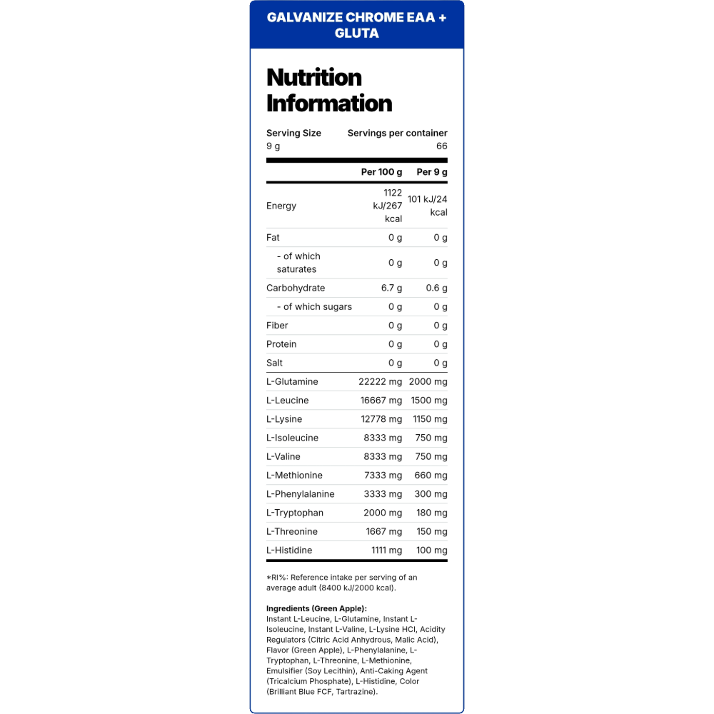 Ingredients: L-Glutamine, Instant L-Leucine, L-Lysine, Instant L-Isoleucine, Instant L-Valine, L-Methionine, Acid (Citric Acid Anhydrous), Flavor (Green Apple), L-Phenylalanine, L-Tryptophan, L-Threonine, Sweetener (Acesulfame K, Sucralose), Anti-caking agent (Tricalcium Phosphate), L-Histidine, Color (Brilliant Blue FCF, Tartrazine).