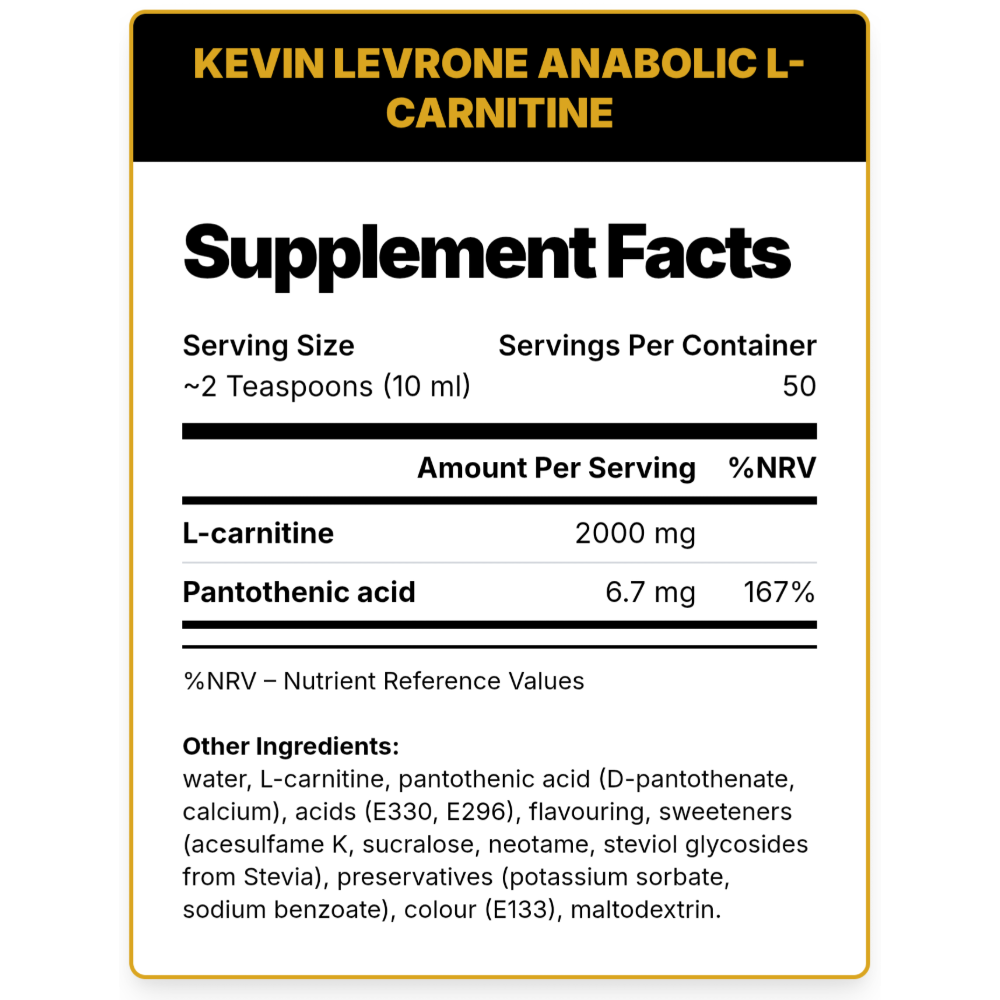 Fuel your workouts and support your metabolism with Kevin Levrone’s Anabolic L-Carnitine from the Signature Series Black Line. This powerful, pasteurized liquid supplement is designed for physically active adults, delivering a potent 2000mg of L-Carnitine per serving to help transport fat for energy. Enriched with Pantothenic Acid, it contributes to a normal energy-yielding metabolism, making it the perfect pre-exercise boost.