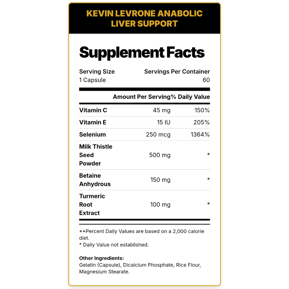 - Anabolic Liver Support Blend: Contains a potent combination of Milk Thistle Seed Powder, Betaine Anhydrous, and Turmeric Root Extract.