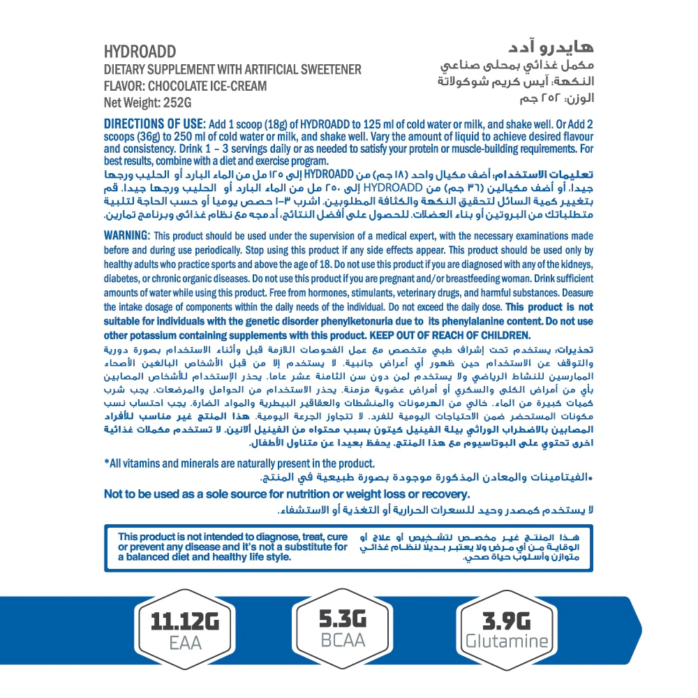 Add 1 scoop (18g) of HYDROADD to 125 ml of cold water or milk, and shake well. For best results and to meet your protein requirements, you can add 2 scoops (36g) to 250 ml of cold water or milk. Vary the amount of liquid to achieve your desired flavor and consistency. Drink 1-3 servings daily or as needed.
