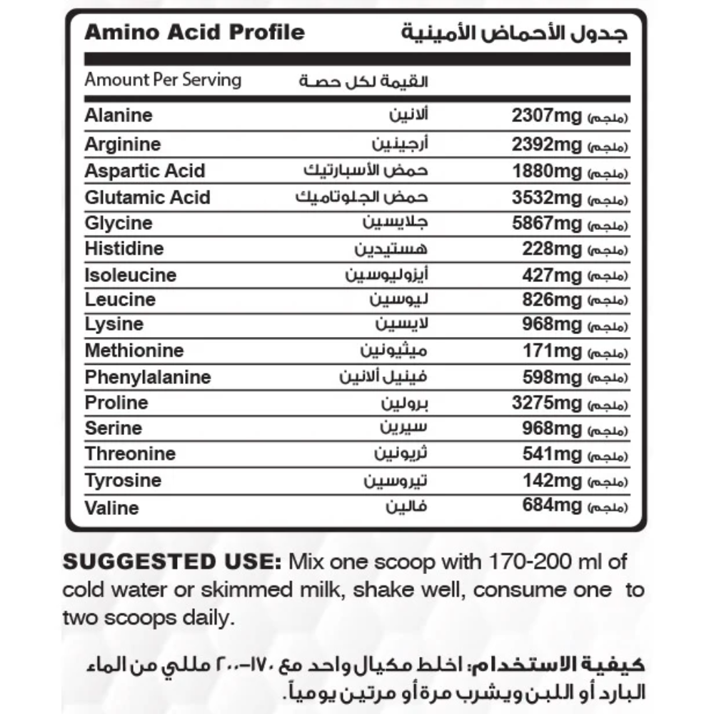 Mix one scoop (34g) with 170-200 ml of cold water or skimmed milk. Shake well and consume one to two scoops daily to meet your protein requirements.