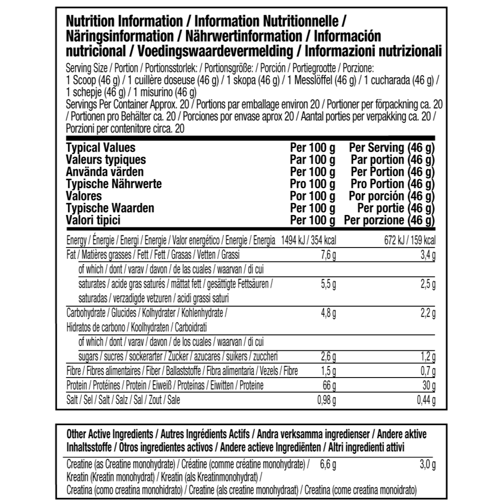 Ingredients: Whey Protein Isolate (providing whey protein isolate and hydrolysed whey protein isolate), Protein and Amino Acid Matrix (whey protein concentrate [milk], L-glutamine, L-leucine, L-isoleucine, L-valine), cocoa powder (processed with alkali), flavourings, salt, sweetener (sucralose, acesulfame K), gum blend (cellulose gum, xanthan gum, carrageenan).