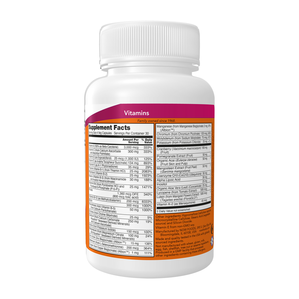 Support your well-being with NOW® EVE™ Capsules, a superior multivitamin formulated specifically for women. This iron-free dietary supplement is packed with essential vitamins, minerals, and superfruits like Pomegranate, Acai, and Mangosteen to provide comprehensive nutritional support. It’s the perfect daily supplement for women seeking to maintain their overall health.