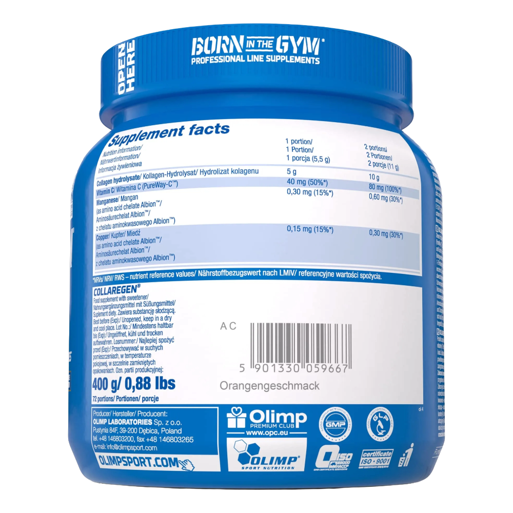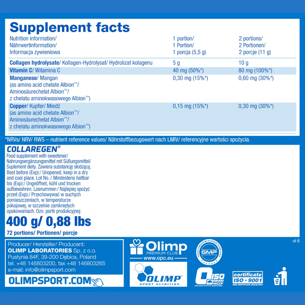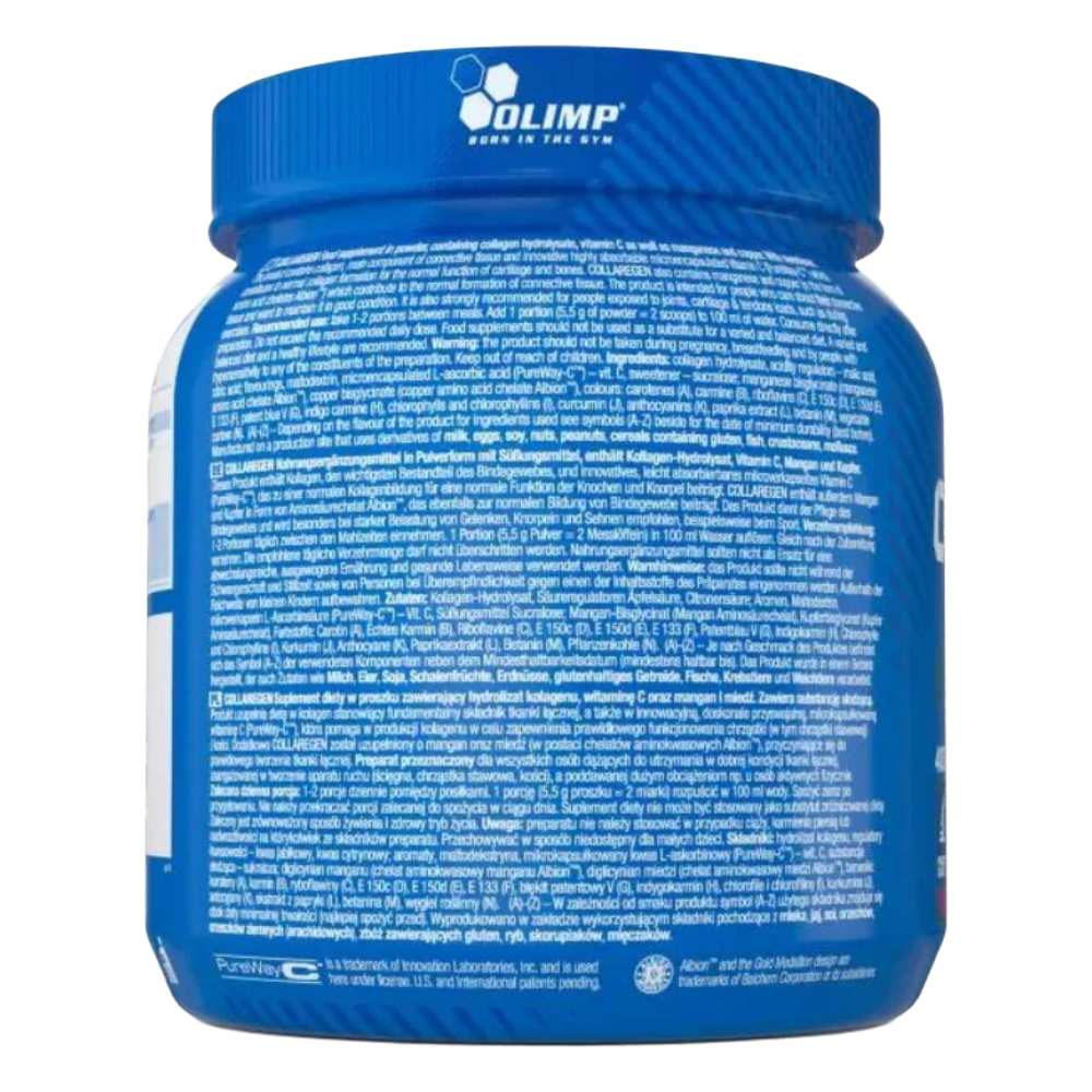 Olimp Collaregen is a food supplement in powder form, meticulously crafted for individuals who care about their connective tissue and want to maintain it in optimal condition. This advanced formula contains a powerful blend of collagen hydrolysate, innovative microencapsulated Vitamin C (PureWay-C®), and Albion™ chelated minerals like manganese and copper. It’s an ideal choice for those who expose their joints, cartilage, and tendons to heavy loads during exercise or daily activities.