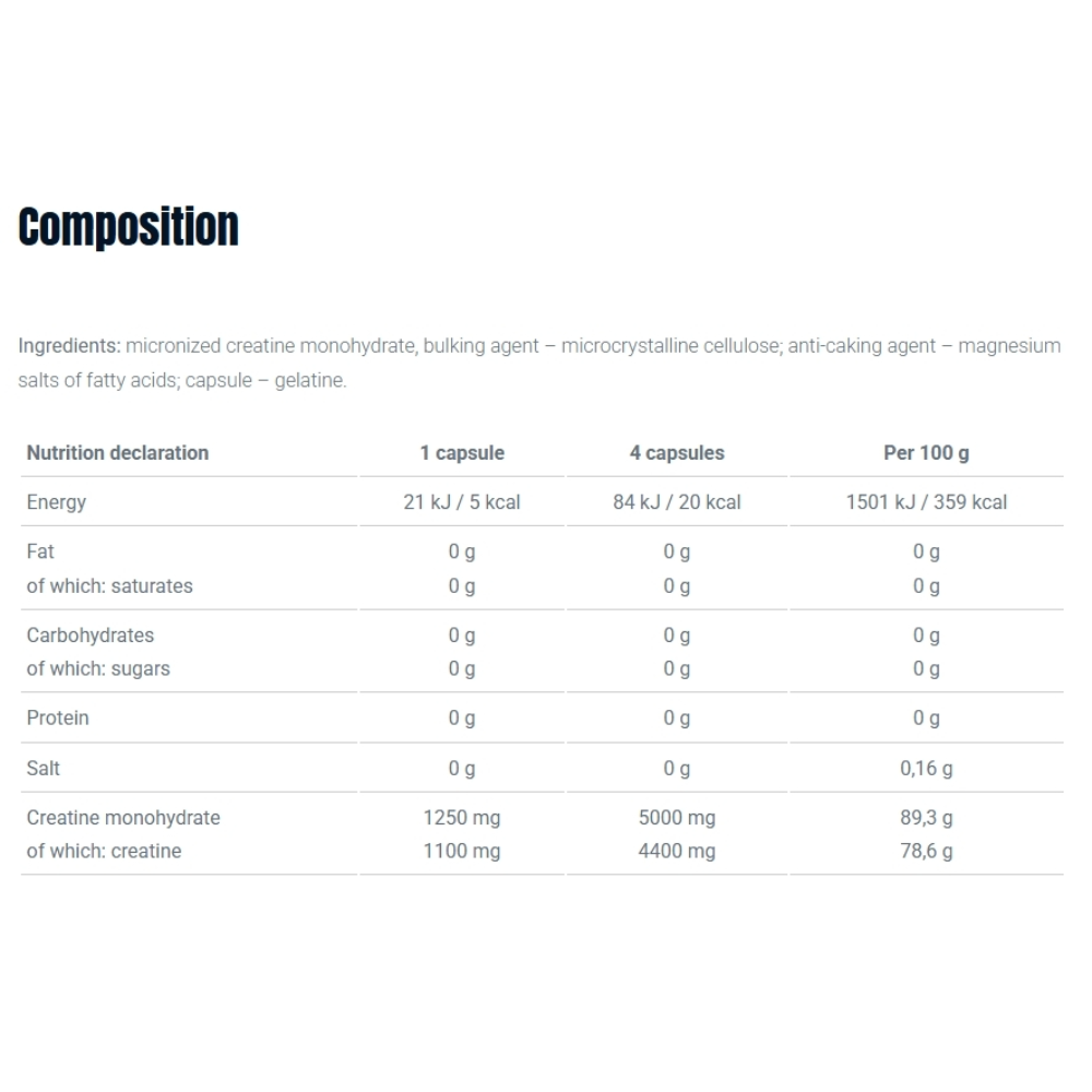 Ingredients: Micronized creatine monohydrate, bulking agent – microcrystalline cellulose; anti-caking agent – magnesium salts of fatty acids; capsule – gelatine.