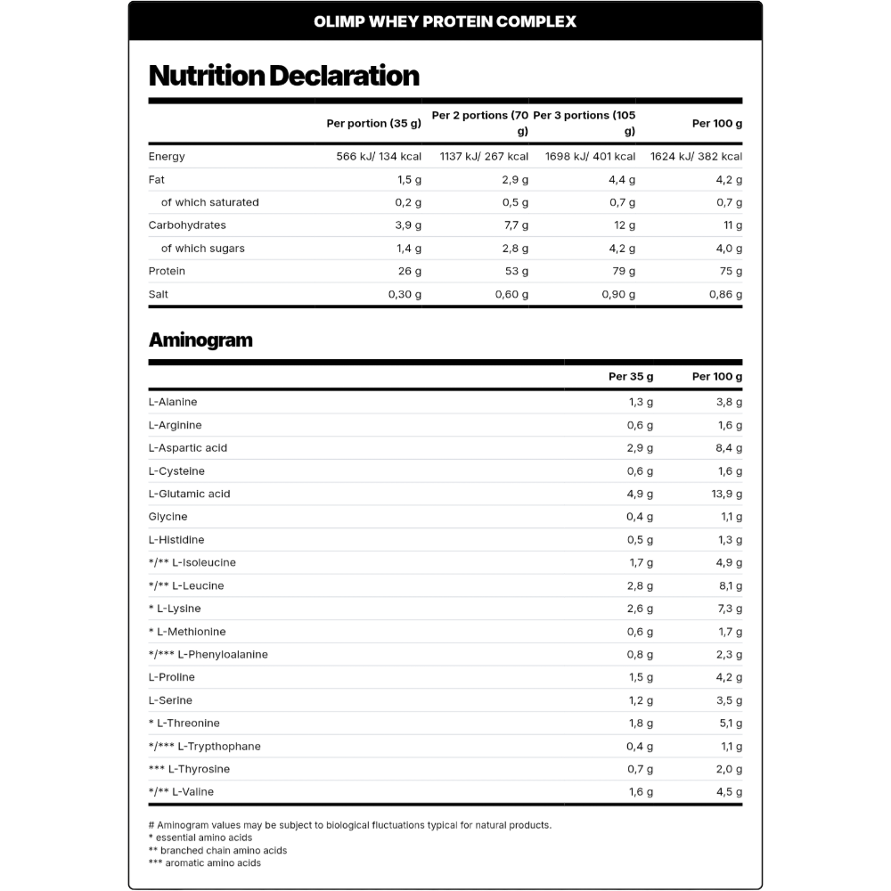 Olimp Whey Protein Complex 100% is a high-protein concentrate designed for physically active people and sportsmen who strive for the development of muscular mass. This ultimate whey protein formula is a blend of high-quality, ultrafiltrated whey protein concentrate (WPC) and whey protein isolate (WPI) in its instant form. With its new incredible taste and aspartame-free formula, it’s the perfect choice to supplement your diet with the protein your muscles need.