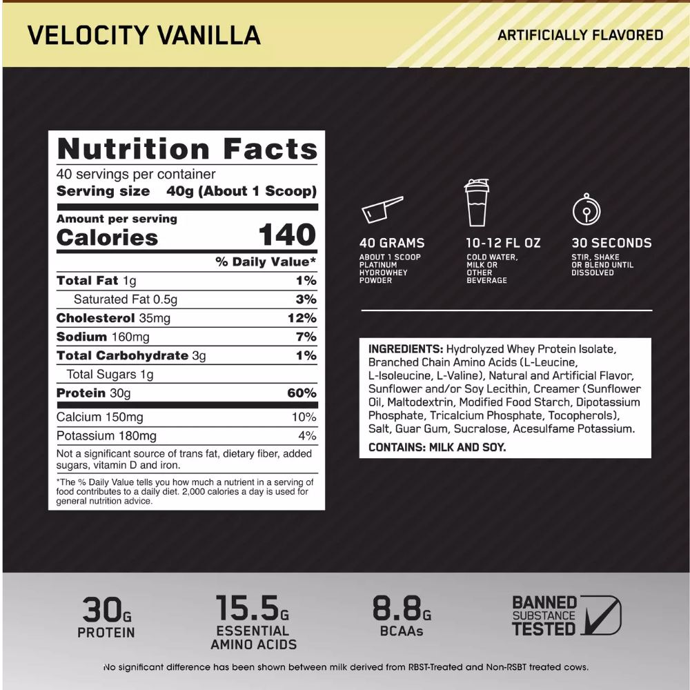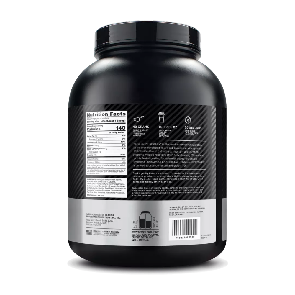 Ingredients: Hydrolyzed Whey Protein Isolate, Branched Chain Amino Acids (L-Leucine, L-Isoleucine, L-Valine), Cocoa Powder (in chocolate flavor), Natural and Artificial Flavor, Sunflower and/or Soy Lecithin, Creamer (Sunflower Oil, Maltodextrin, Modified Food Starch, Dipotassium Phosphate, Tricalcium Phosphate, Tocopherols), Salt, Guar Gum, Sucralose, Acesulfame Potassium.