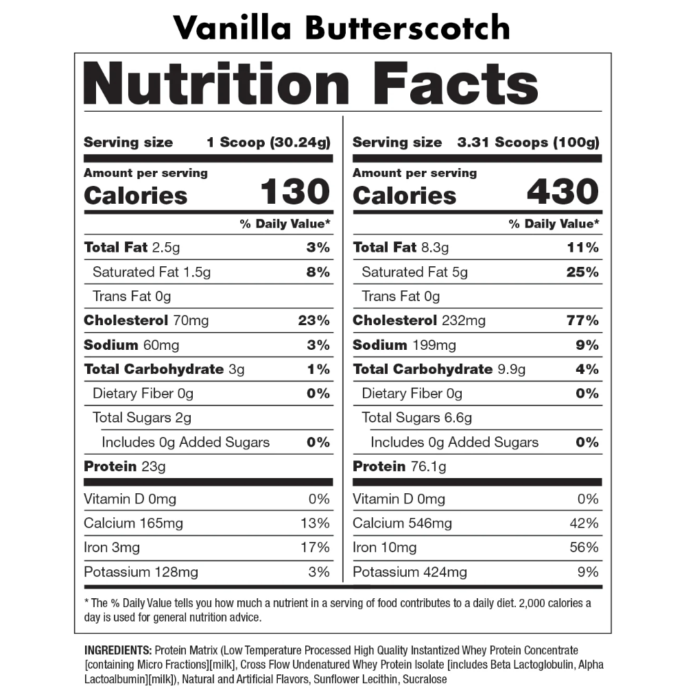 Ingredients: Protein Matrix (Low Temperature Processed High Quality Instantized Whey Protein Concentrate [containing Micro Fractions][milk], Cross Flow Undenatured Whey Protein Isolate [includes Beta Lactoglobulin, Alpha Lactoalbumin][milk]), Natural and Artificial Flavors, Salt, Sunflower Lecithin, Sucralose.