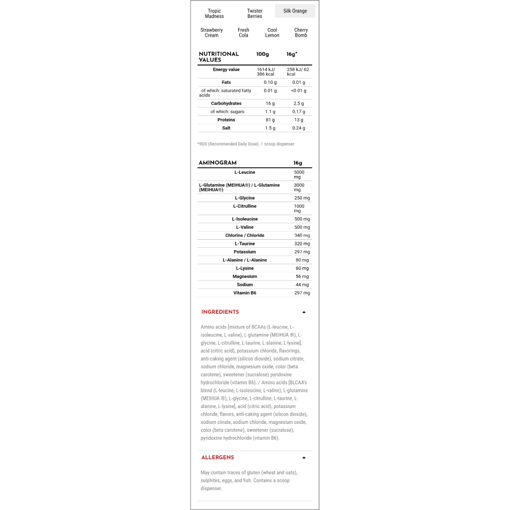 Ingredients: Amino acids [mixture of BCAAs (L-leucine, L-isoleucine, L-valine), L-glutamine (MEIHUA®), L-glycine, L-citrulline, L-taurine, L-alanine, L-lysine], acid (citric acid), potassium chloride, flavorings, anti-caking agent (silicon dioxide), sodium citrate, sodium chloride, magnesium oxide, color, sweetener (sucralose), pyridoxine hydrochloride (vitamin B6).